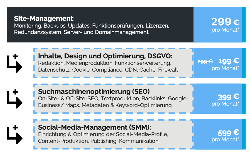 - Die genannten Preise gelten für Internetseiten mit maximal 10 statischen Unterseiten sowie höchstens 1 dynamische Funktionsseiten (Kontaktformular o.ä.). Volumenupgrades sind jederzeit für 50 € p.M. für jew. weitere 10 Seiten möglich. Web-Shops sind aufpreispflichtig: + 99 € p.M.